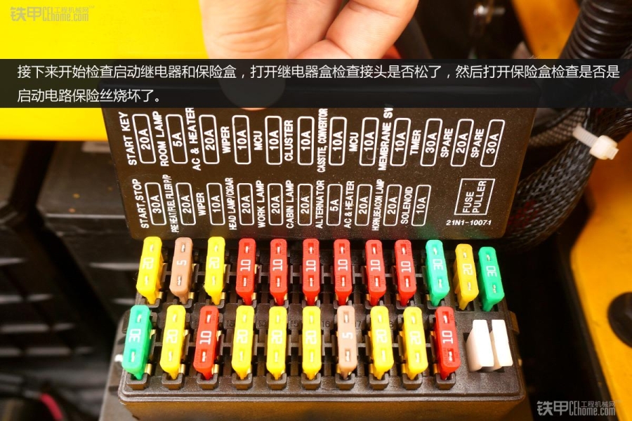 接下来开始检查启动继电器和保险盒,打开继电器盒检查接头是否松了,然后打开保险盒检查是否是启动电路保险丝烧坏了。