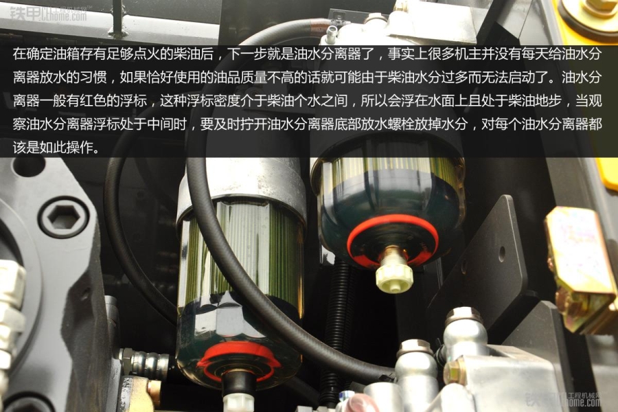 在确定油箱存有足够点火的柴油后,下一步就是油水分离器了,事实上很多机主并没有每天给油水分离器放水的习惯,如果恰好使用的油品质量不高的话就可能由于柴油水分过多而无法启动了。油水分离器一般有红色的浮标,这种浮标密度介于柴油个水之间,所以会浮在水面上且处于柴油地步,当观察油水分离器浮标处于中间时,要及时拧开油水分离器底部放水螺栓放掉水分,对每个油水分离器都该是如此操作。