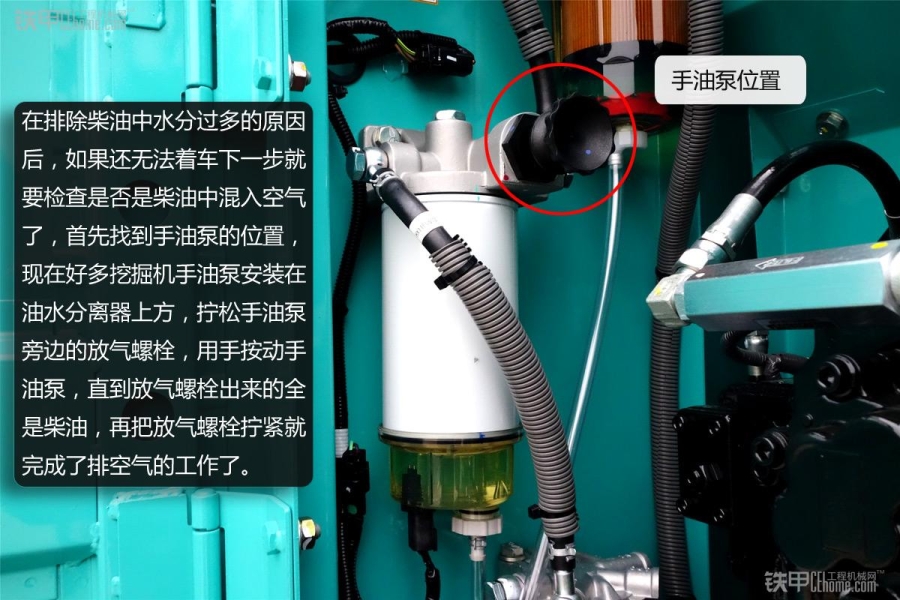 在排除柴油中水分过多的原因后,如果还无法着车下一步就要检查是否是柴油中混入空气了,首先找到手油泵的位置,不同品牌的发动机手油泵安装位置不同,有的是安装在柴油泵附近,有的是外加了电子油泵所以就不需要手动排空气,目前在售大部分挖掘机手油泵安装在油水分离器上方,拧松手油泵旁边的放气螺栓,用手按动手油泵,直到放气螺栓出来的全是柴油,再把放气螺栓拧紧就完成了排空气的工作了。